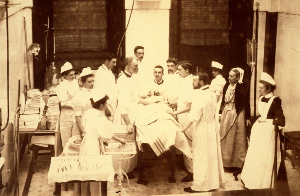 William Macewen (standing to left, hand on patient) operates as Rebecca Strong looks on (right wearing grey dress and black cardigan). Photograph courtesy of NHSGGC Medical Illustration Services